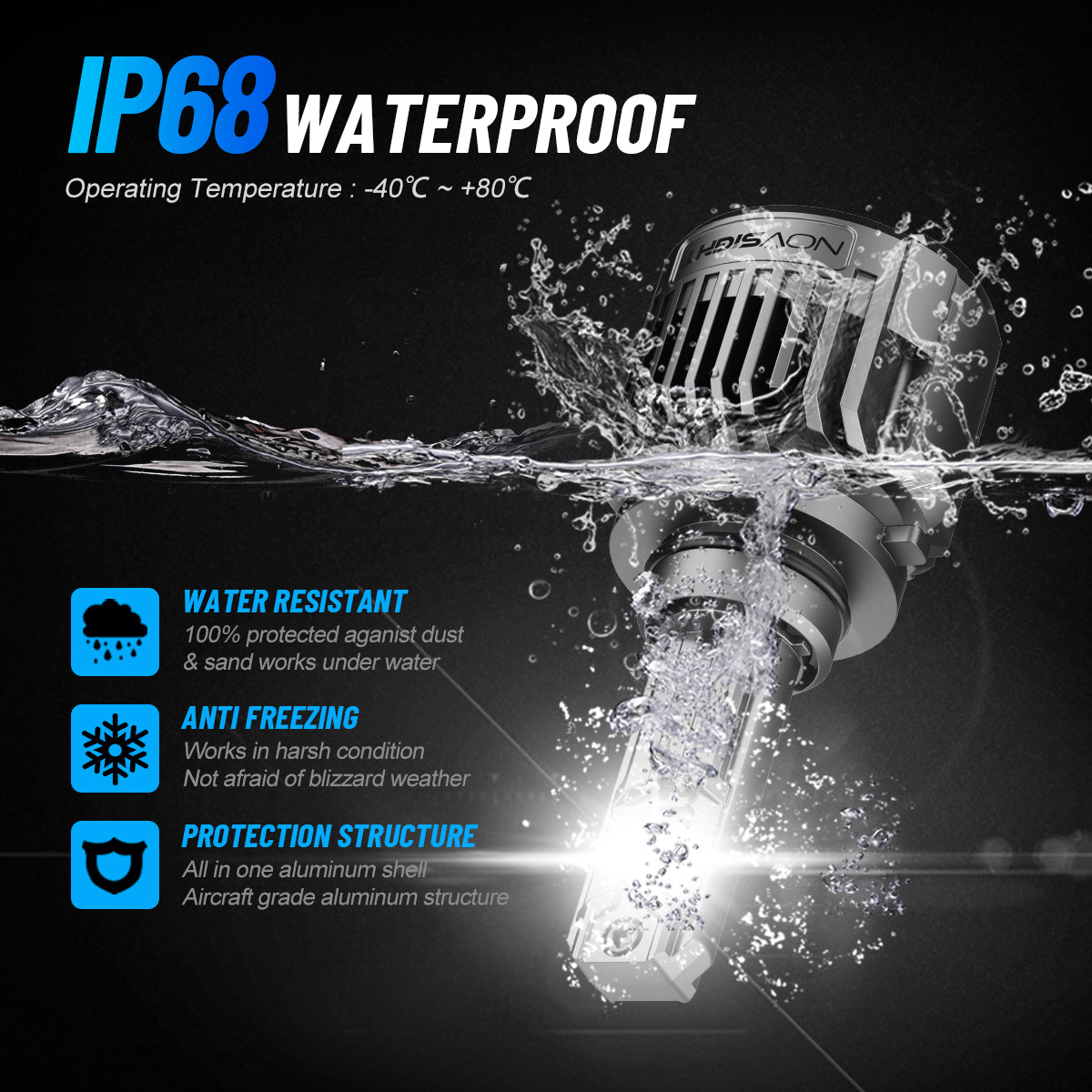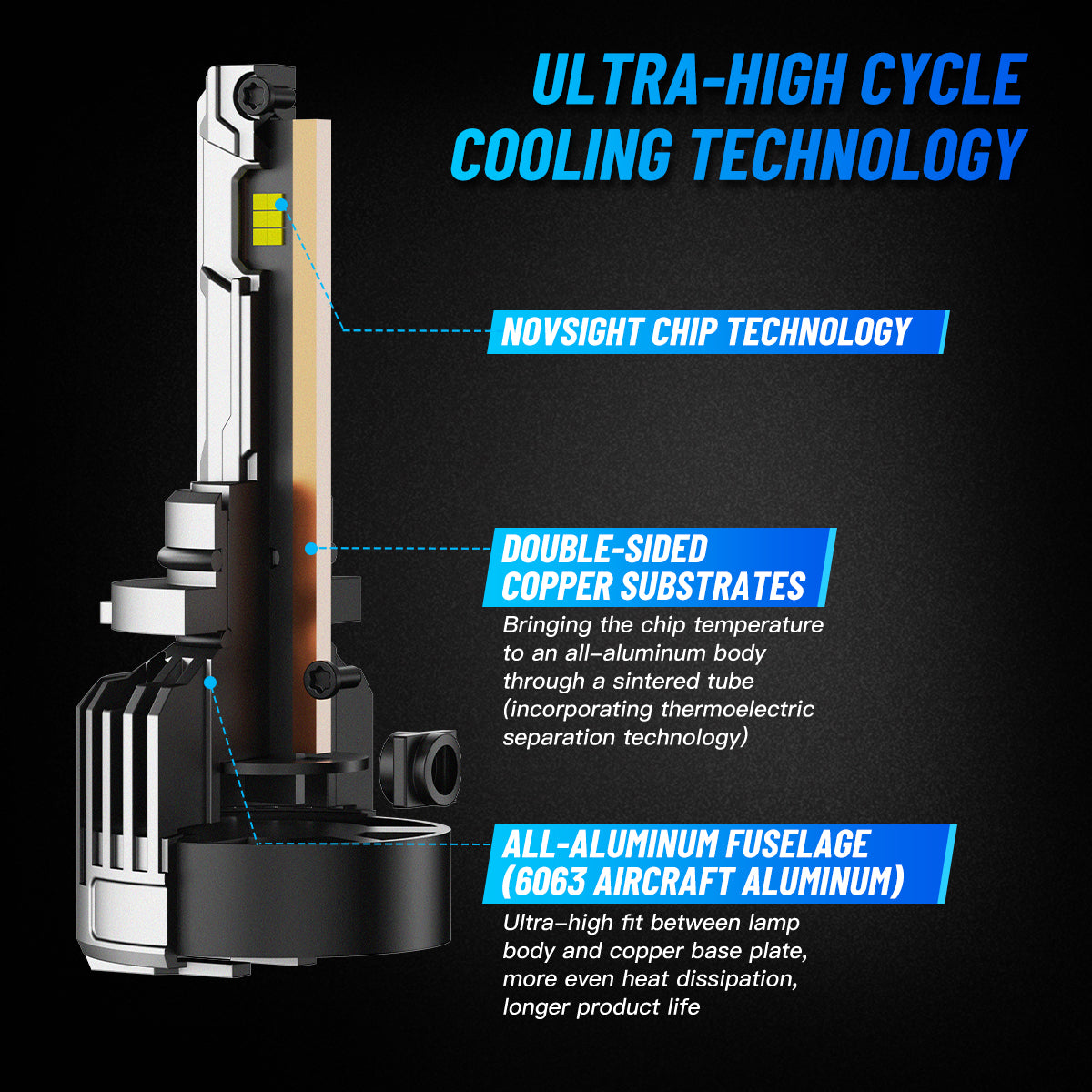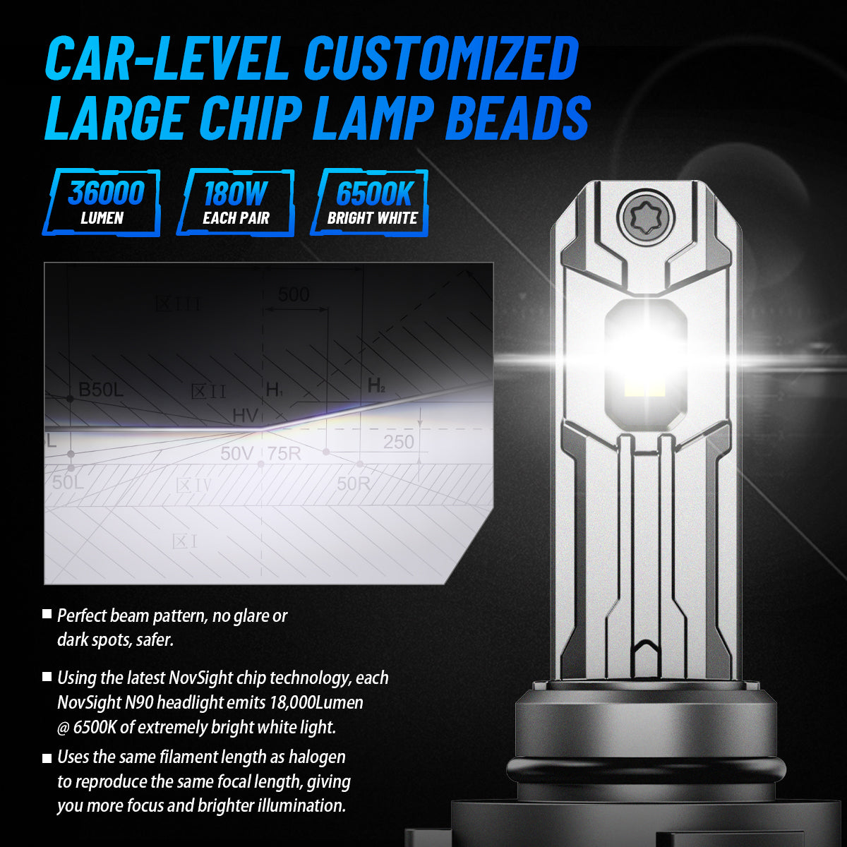 The Novsight N90 LED bulb is designed for perfection, these bulbs achieve a flawless beam pattern that eliminates glare and dark spots, ensuring a safer and clearer driving experience. With superior brightness powered by high-grade NovSight chip technology, they emit an impressive 36,000 lumens per pair at a crisp 6500K bright white colour temperature, dramatically enhancing your nighttime visibility. The advanced cooling system, featuring double-sided copper substrates and an aviation-grade aluminium shell, guarantees optimal heat dissipation for stable performance. Plus, the built-in CANBUS driver ensures instant startup without radio interference, while robust waterproofing keeps your bulbs protected in any weather. Upgrade your ride today and illuminate the road ahead!