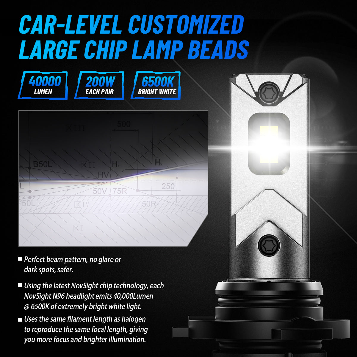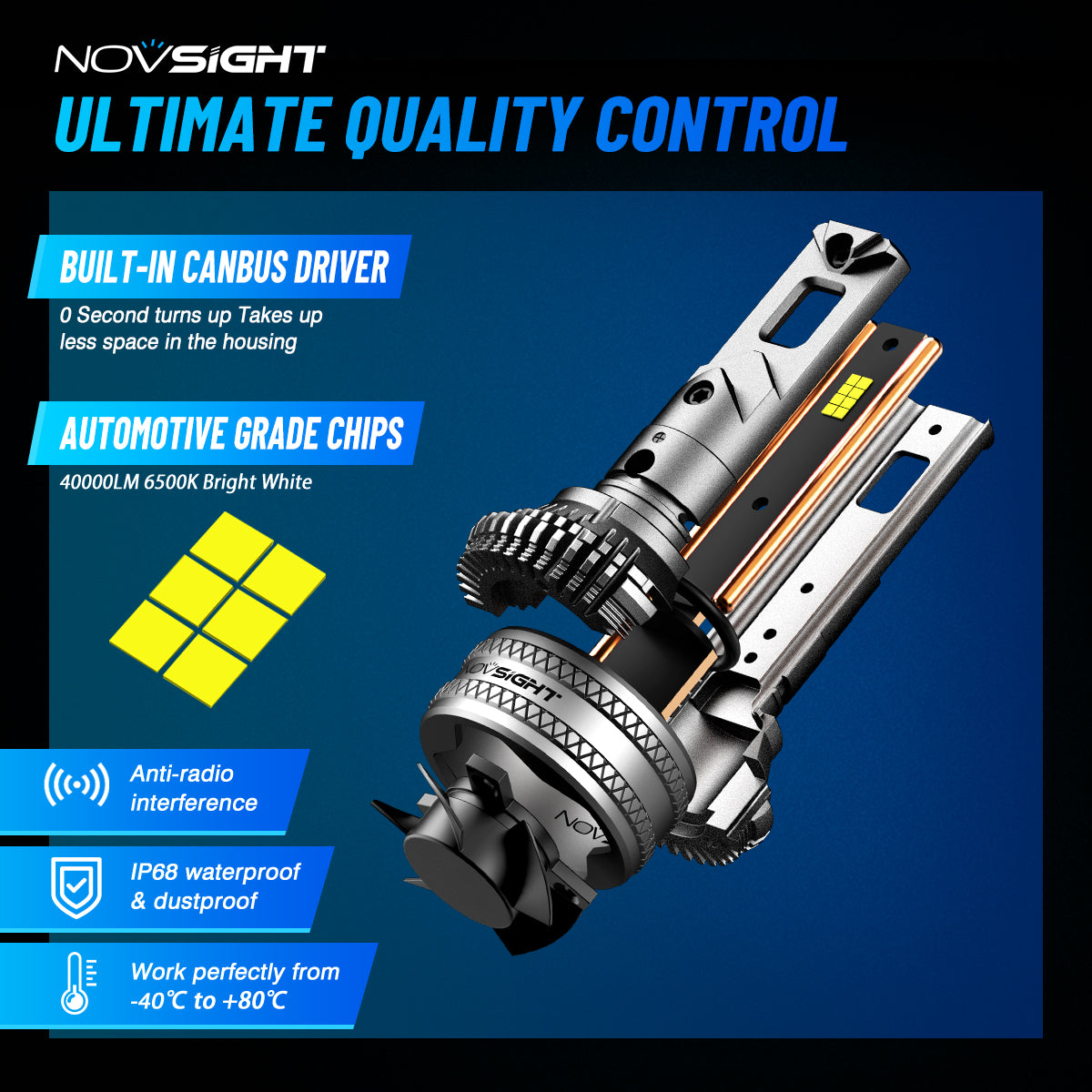 The Novsight N96 automotive LED headlight bulb is engineered for superior brightness and safety on the road. Delivering an astonishing 40,000 lumens of crisp 6500K bright white light, these bulbs enhance visibility during nighttime drives and adverse weather conditions. Built with durable aluminium and advanced heat dissipation technology, they promise longevity and resilience against daily wear. Installation is a breeze with their perfect fit for most vehicles and a compact built-in CANBUS driver, ensuring you can upgrade your lighting without hassle. Experience improved road safety, energy savings, and reliable performance in all weather conditions with Novsight LED bulbs—your ultimate driving companion!
