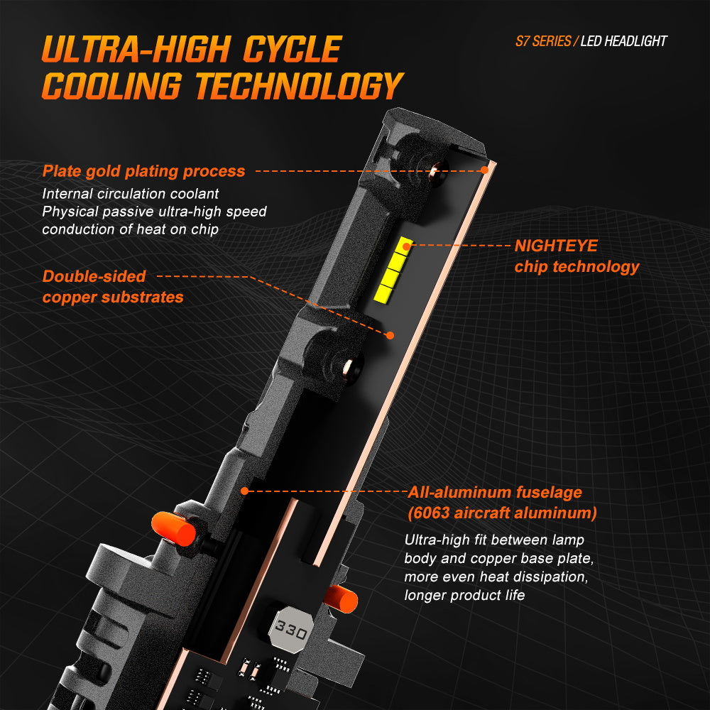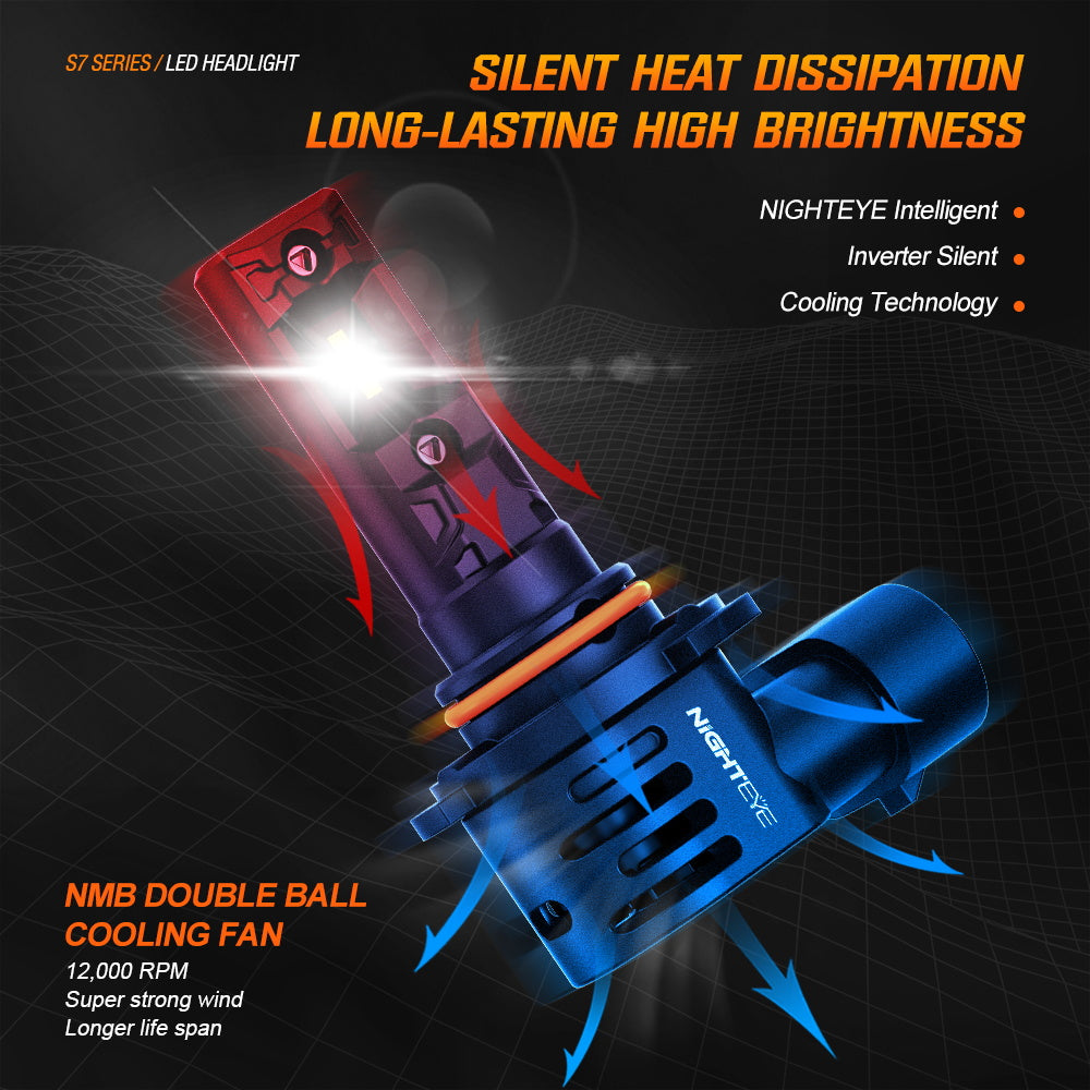 Nighteye S7 LED Headlight Bulbs are engineered for exceptional performance and efficiency. With a power output of just 70W per pair, these bulbs deliver an impressive 20,000 lumens of bright, 6500K white light, ensuring maximum visibility in any conditions. Designed to last over 100,000 hours, they significantly reduce the hassle and cost of frequent replacements. Plus, with an IP68 waterproof rating, you can trust these bulbs to perform flawlessly, rain or shine. Upgrade your vehicle's lighting and experience safer, more confident nighttime driving.